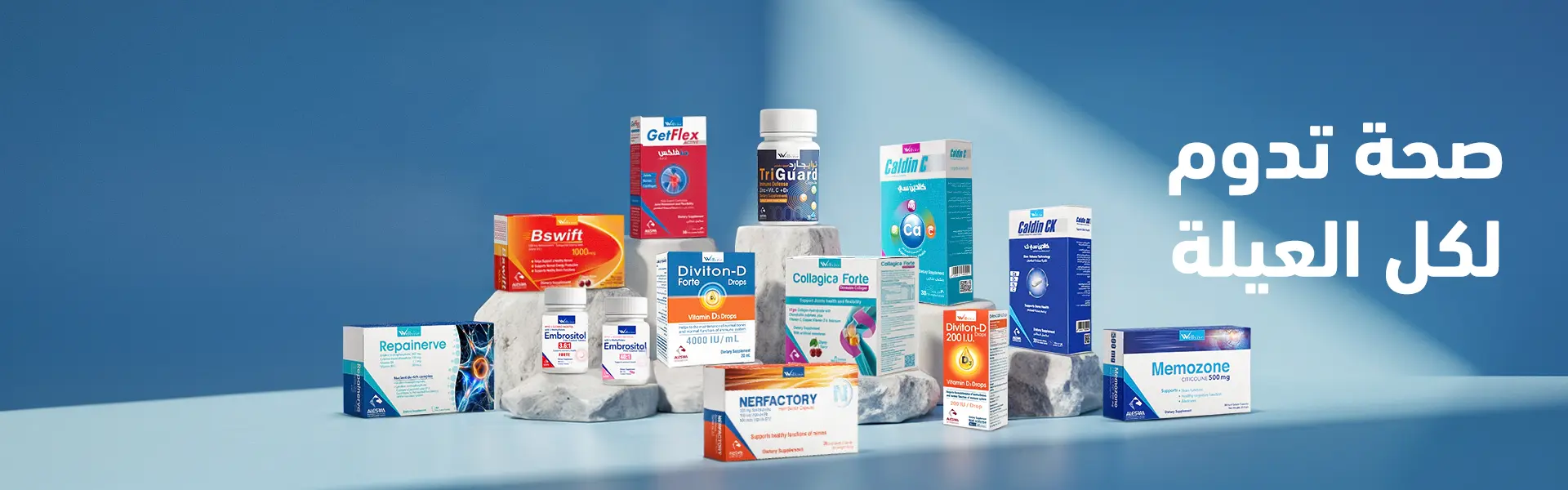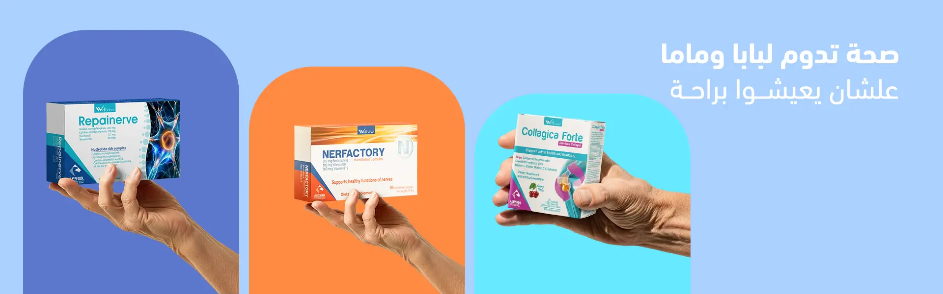 Wellvive is a range of dietary supplements by Al Esraa Pharmaceuticals, designed to support overall health, immunity, bones, nerves, skin, and hair.